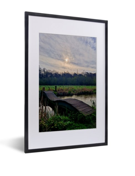 Op deze foto zie je een bruggetje in een natuurgebied in Limburg. De zon laat zich voorzichtig zien tussen de wolken door. Het begin van de dag, wat zal deze brengen?
