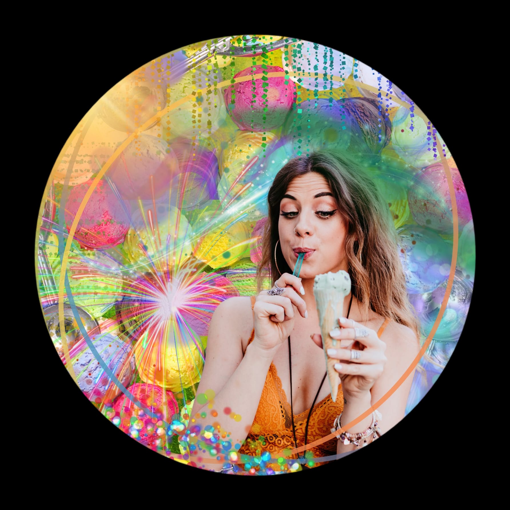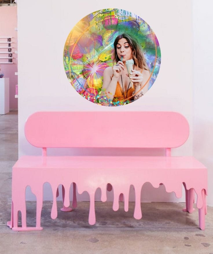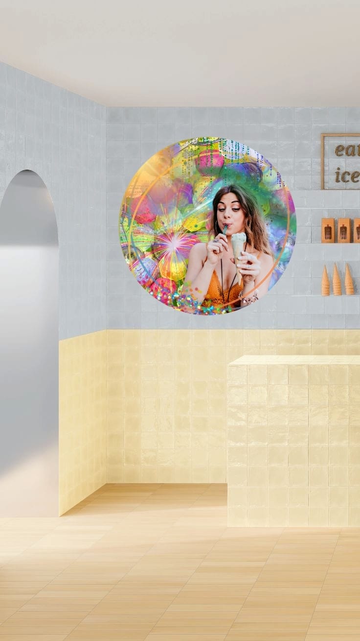 Muurcirkel vol met kleur waarbij een vrouw geniet van haar ijsje. Diameter 100 cm. Dit design is opgebouwd met meerdere lagen waardoor je steeds iets nieuws ontdekt!