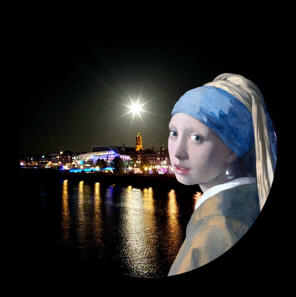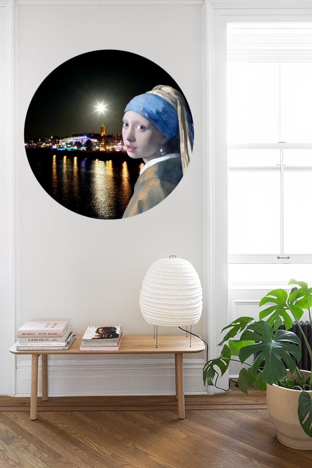 Muurcirkel met het bekende 'meisje met de parel' op de voorgrond. De skyline van Venlo tijdens de kermis vormt de achtergrond.