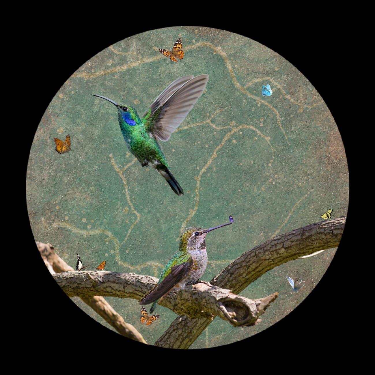 Muurcirkel Kolibrie. Bijzonder mooie wandcirkel met twee kolibrie´s, vlinders en een grote tak. De achtergrond is verweerd groen met goud en bronzen accenten. Diameter 70 cm.