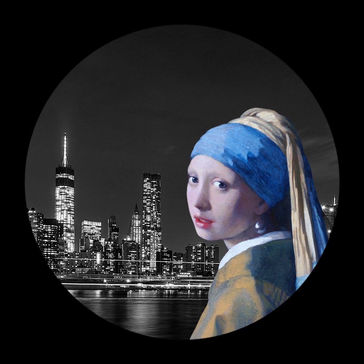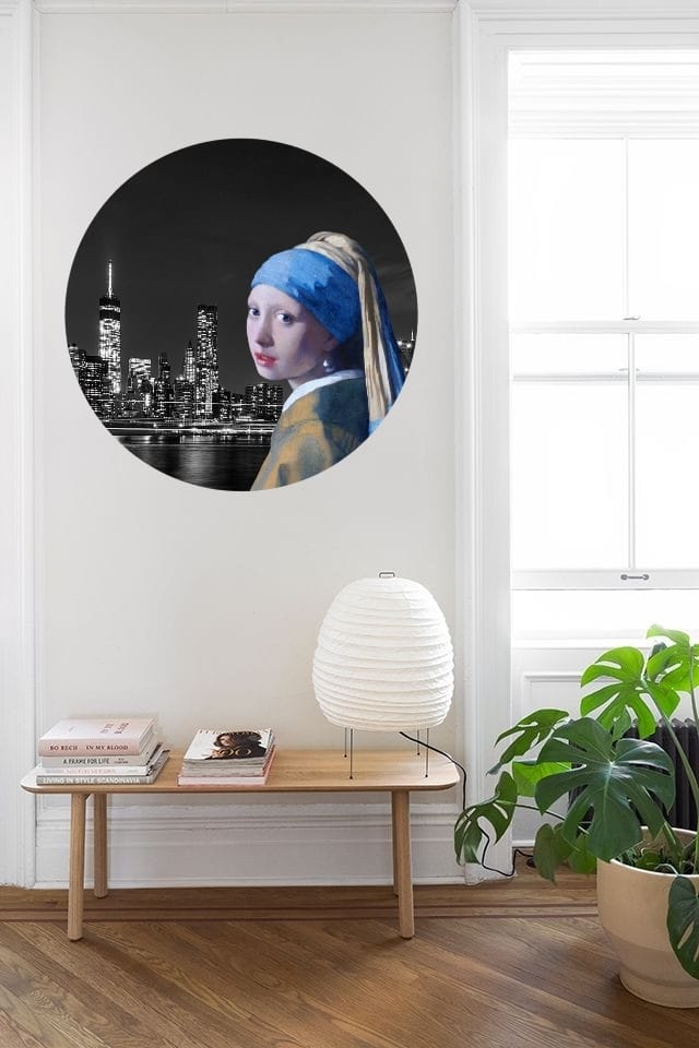 Muurcirkel met het bekende 'meisje met de parel' op de voorgrond. De skyline van New York vormt de achtergrond. Diameter is 100 cm.