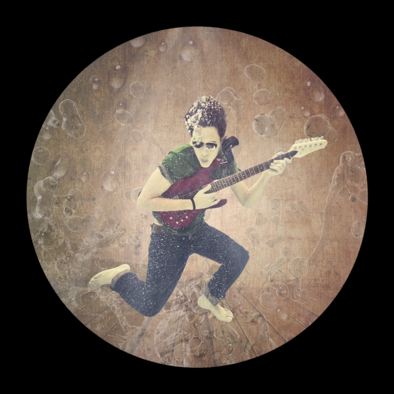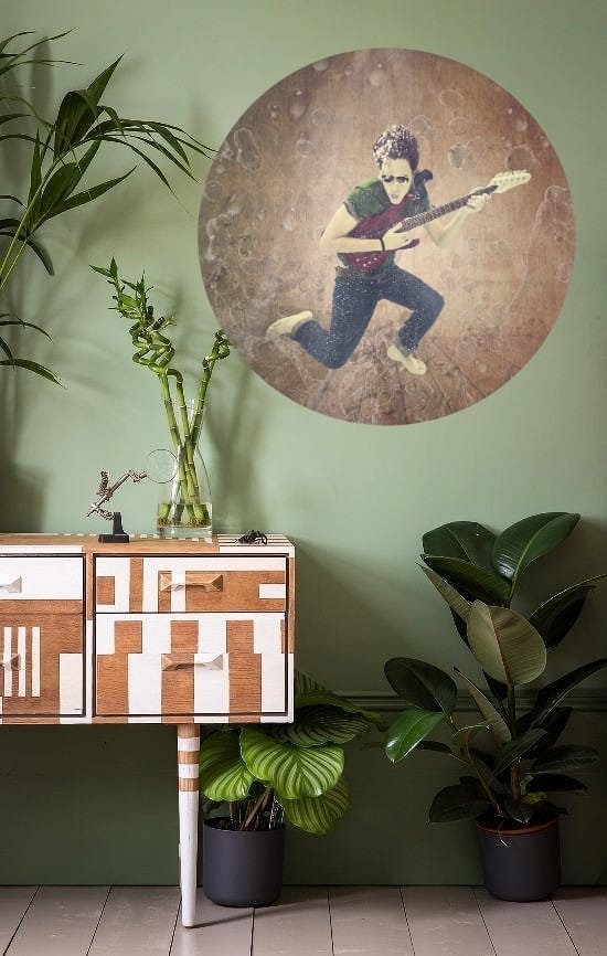 Muzikale muurcirkel: Rock 'n Roll Guy! Deze rocker lijkt onderwater gitaar te spelen terwijl hij tegelijker tijd in een retro woonkamer staat. Uniek design! Diameter 100cm.