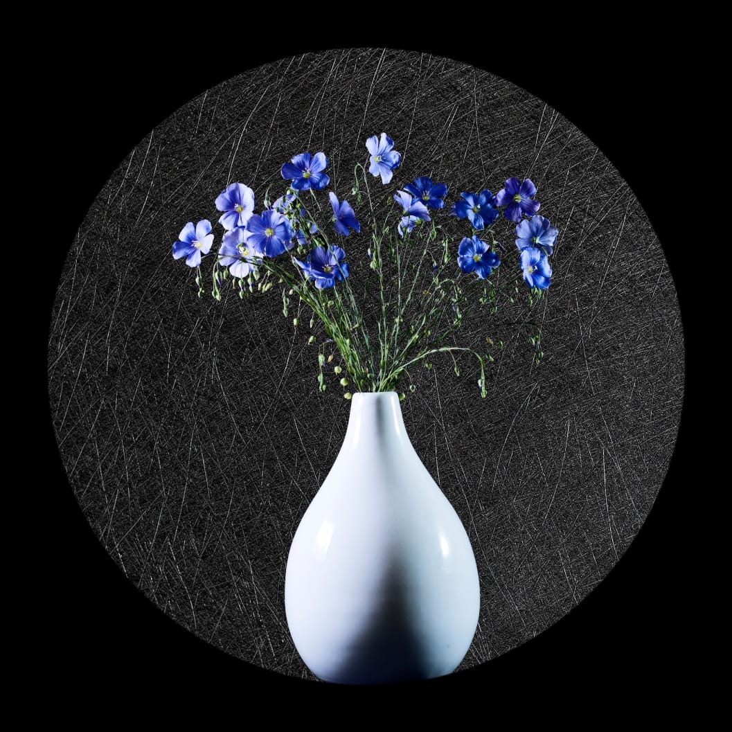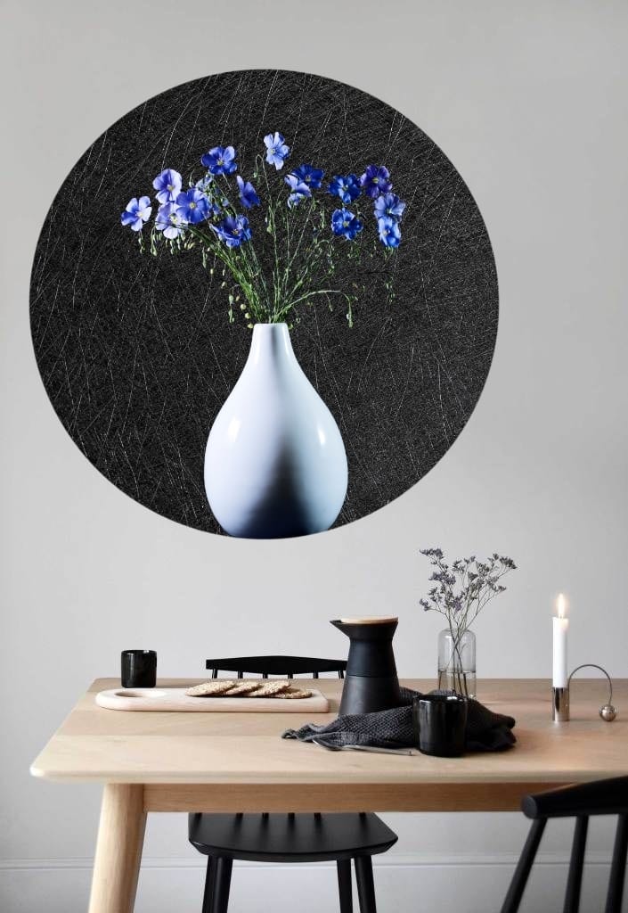 Muurcirkel met een vaas vol blauwe bloemen. De achtergrond heeft een mooi reliëf effect wat er stoer en toch romantisch uit ziet. Diameter 70 cm.